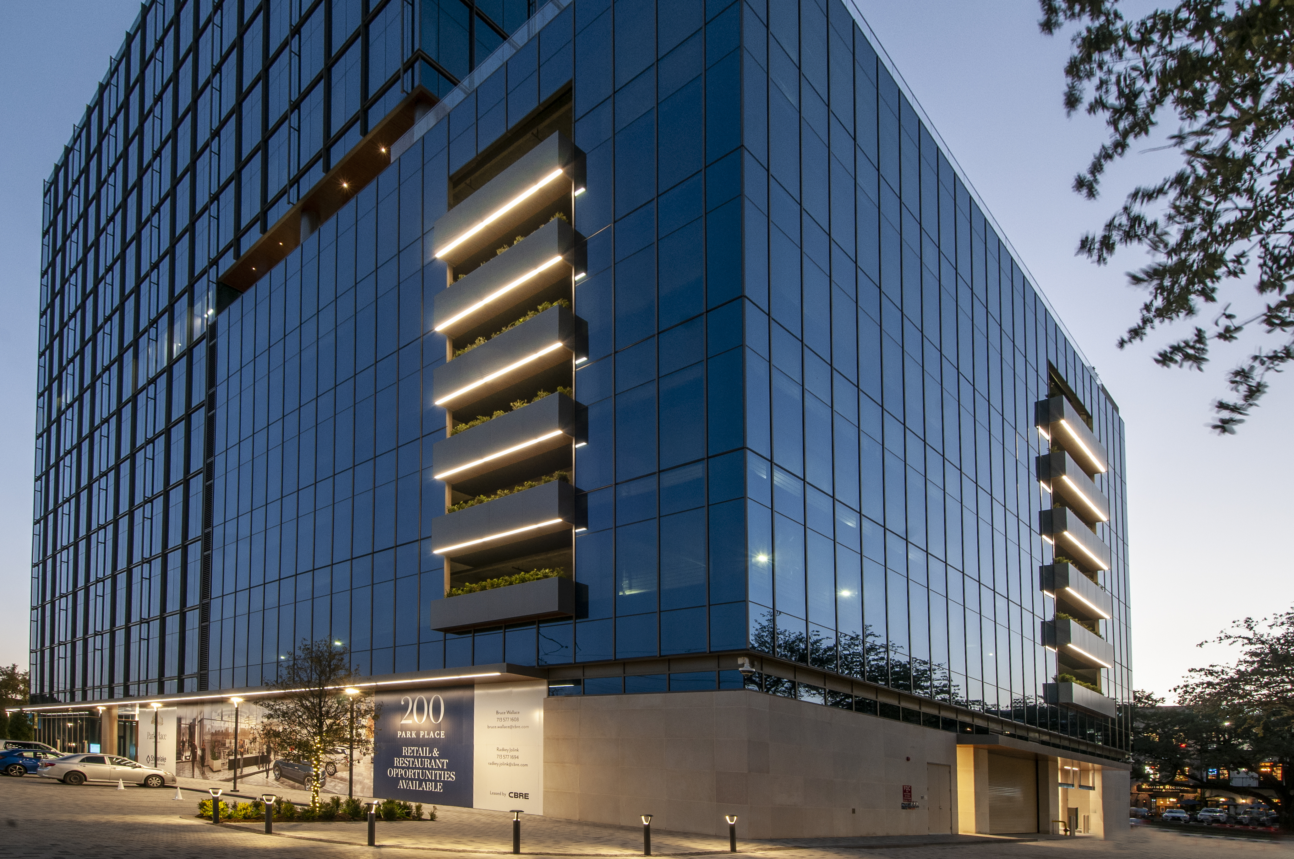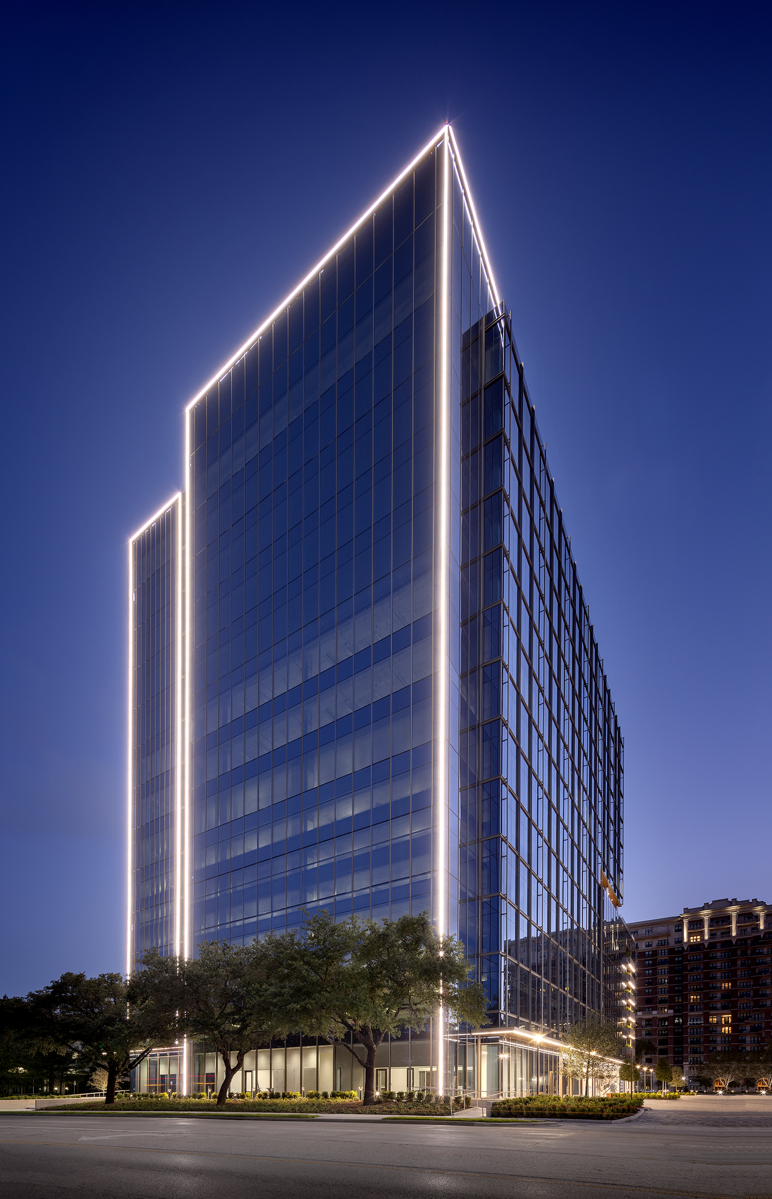 G2LD collaborated with The Beck Group on this office high-rise building located in a bustling area of River Oaks. What stands now was not initially how the client envisioned the project, however, since the design was shifted as a result of Hurricane Harvey’s destruction to Houston. After careful consideration and some forward-thinking, the building now consists of an all above ground parking garage and over 200,000 square feet of office space. Juxtaposing the busy interior business program are landscaped spaces surrounding the building and a roof top terrace. G2LD was responsible for the facade lighting, landscape lighting of the terrace and ground floor, accent lighting on the garage facade, main conference room on the amenity level, and main lobby on level 1.